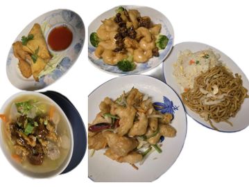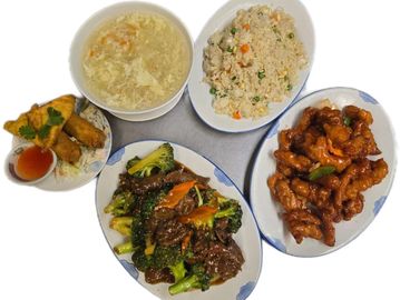 ( Serving from 11AM -- 9 PM ) (All plates server with a cup of daily soup: either egg flower or hot sour soup, one egg roll, and choice of either a white rice, or veg fried rice, or veg chow mein, or both.) (Sorry ! Soup doesn’t come with to-go order.)
