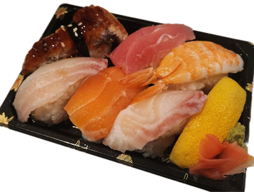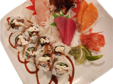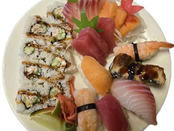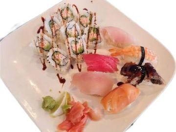 6 pcs sushi , 6 pcs sashimi and calif roll