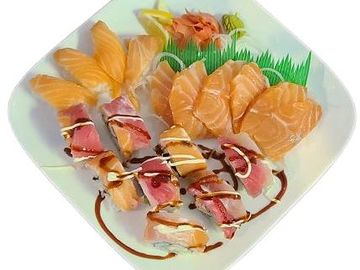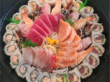 12 pcs sushi, 18 pcs sashimi, calif roll, salmon roll, tuna roll